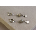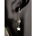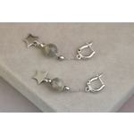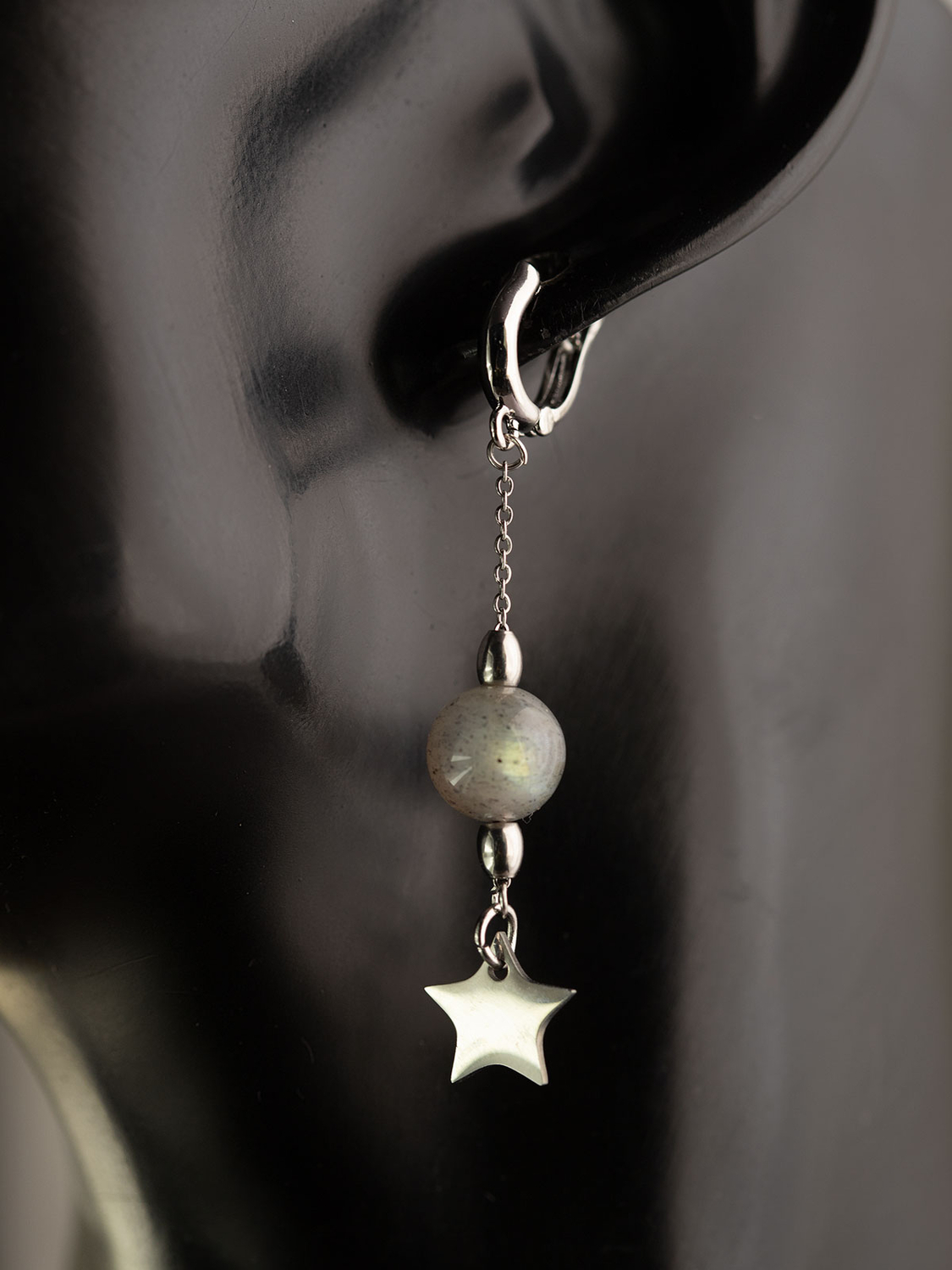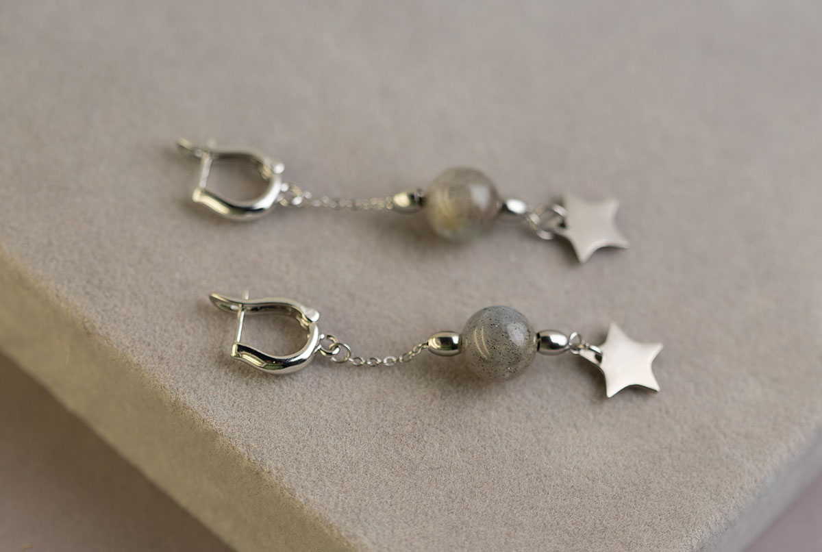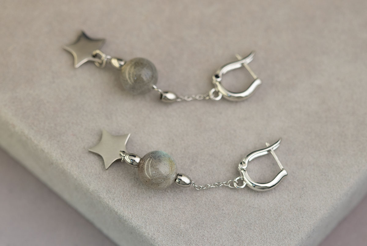 Основной элемент: шарик из натурального лабрадора диаметром 10 мм — камень с характерной игрой света и переливами от серо‑голубого до золотисто‑зелёного.