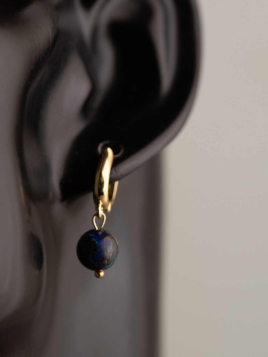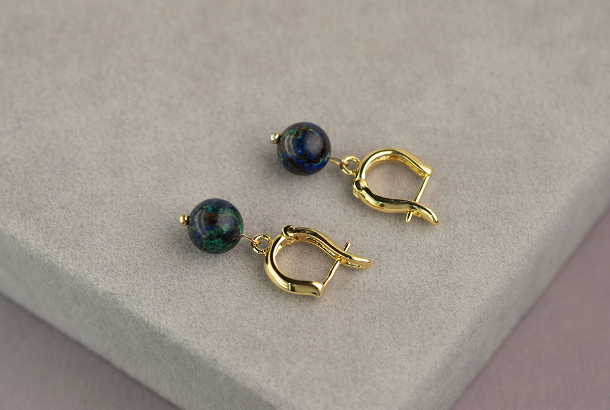 Маленькие серьги с натуральным азурмалахитом синего цвета с зелёными вкраплениями на золотистых застёжках с английским механизмом. Небольшой размер и лаконичный дизайн позволят носить украшение каждый день с любым образом.