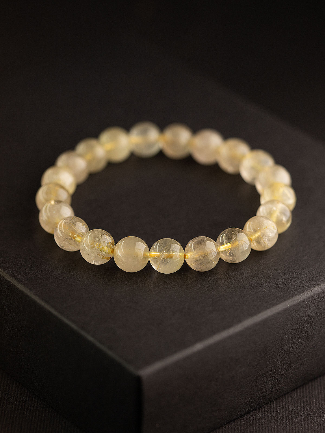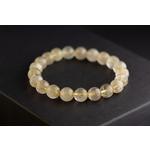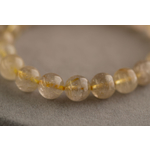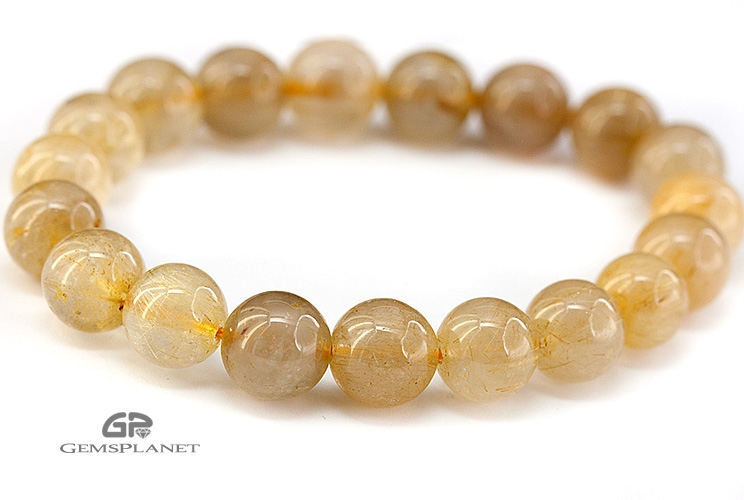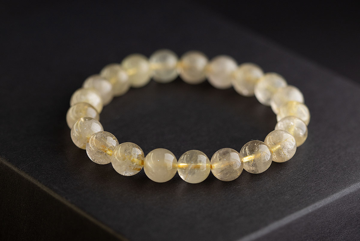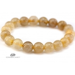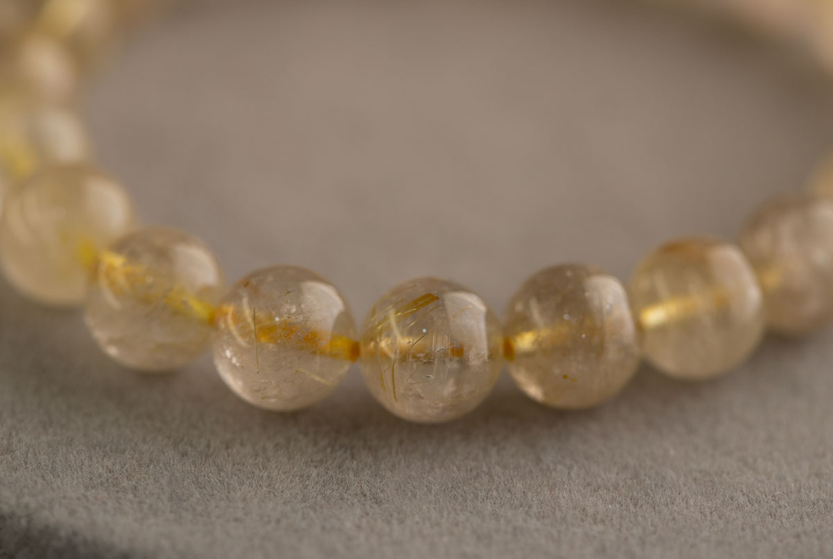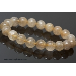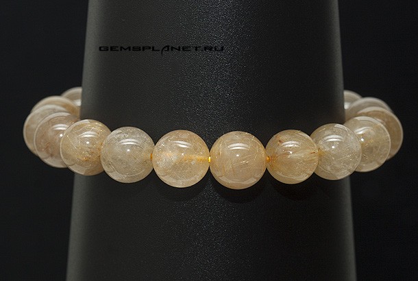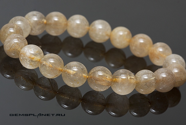 Браслет из натурального кварца волосатика с тонкими игольчатыми включениями золотистого рутила (кварца «Волосы Венеры»). Гладкие бусины-шарики собраны на эластичную многослойную резинку без замка.