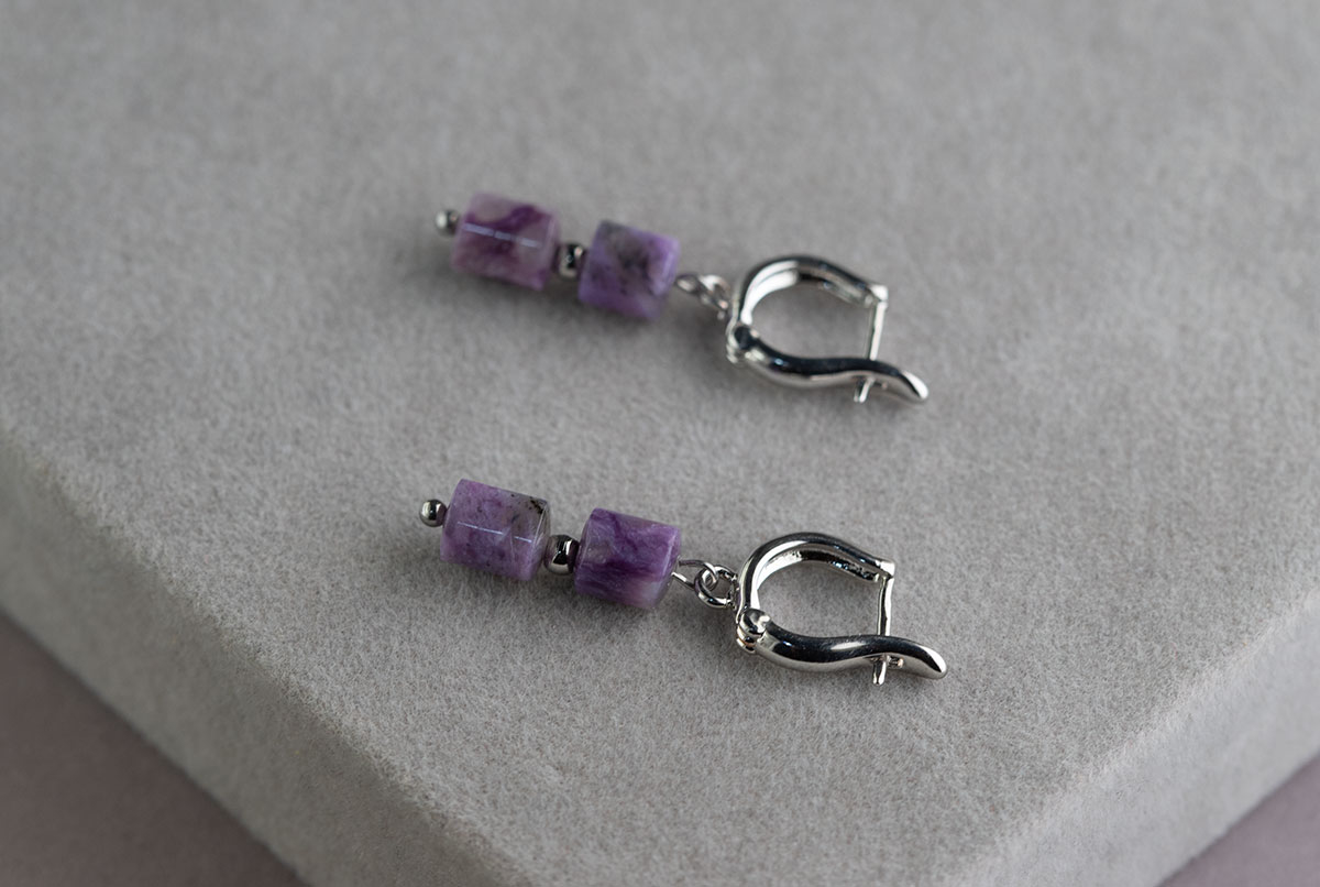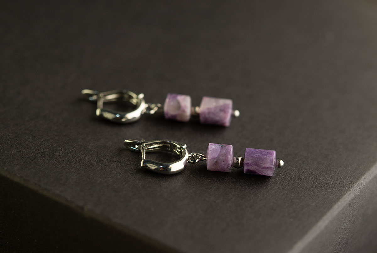Чароит — уникальный природный камень, известный своими неповторимыми сиреневыми оттенками. Эти элегантные серьги станут истинным украшением вашей коллекции.