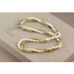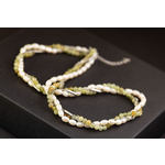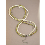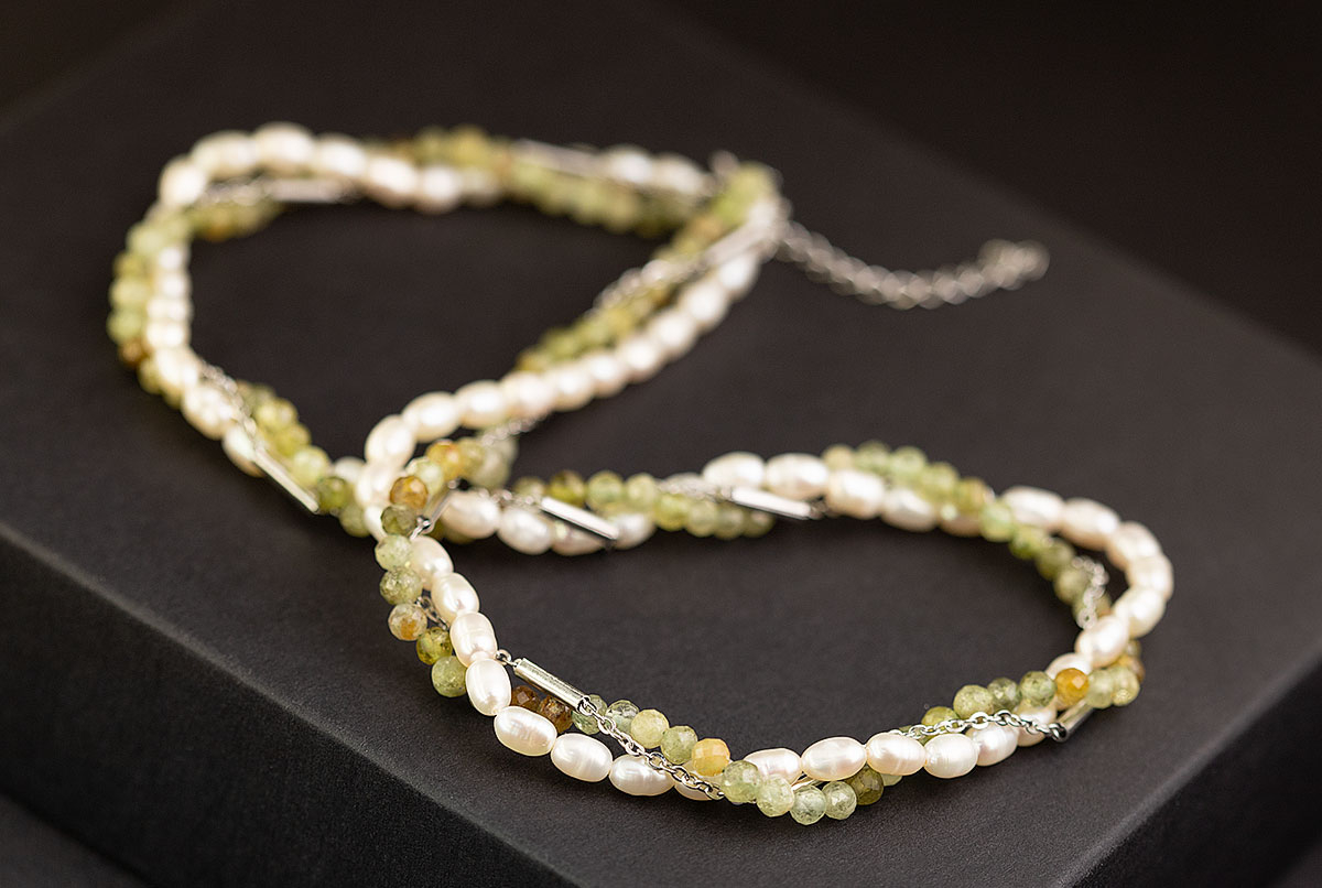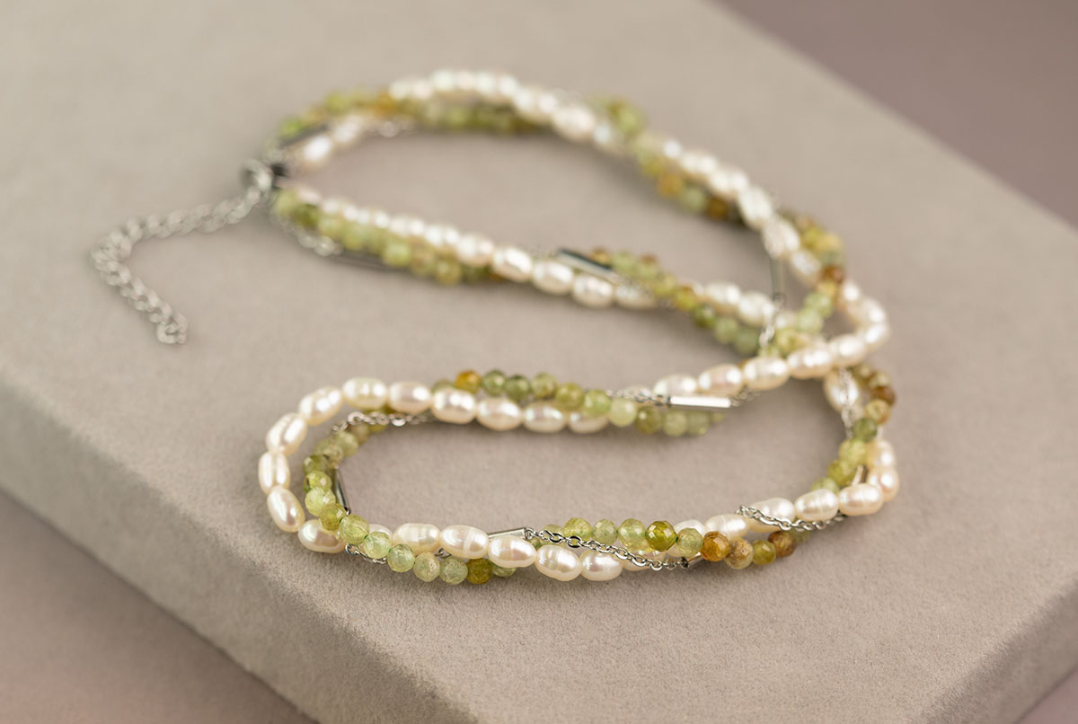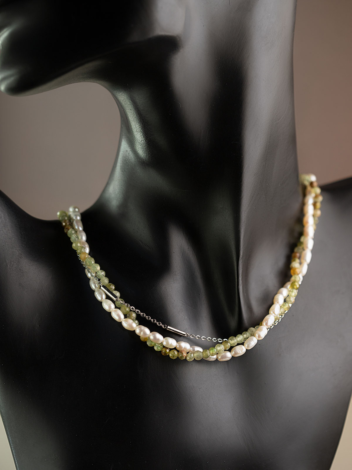 Три нити разной фактуры формируют выразительный многослойный образ: Тонкая стальная цепочка — прочная основа с деликатным металлическим блеском. Придаёт изделию лёгкость и современный характер. Зелёный гранёный гранат — яркий природный элемент. Грани камней эффектно преломляют свет, добавляя бусам глубину и выразительность. Белый культивированный жемчуг — классический акцент с нежным перламутровым сиянием. Смягчает композицию и создаёт изысканный контраст с гранатом. Замок‑карабин — надёжная застёжка, обеспечивающая удобство использования. Удлиняющая цепочка — позволяет регулировать длину бус, подстраивая их под особенности шеи и предпочтения владелицы.