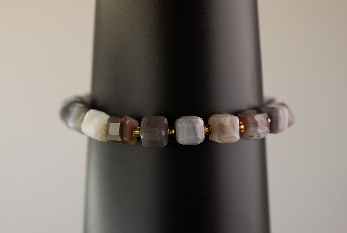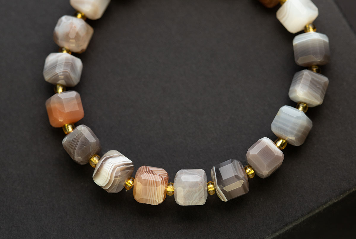 - Стильный дизайн: сочетание гранёных кубиков агата и золотистого бисера создаёт эффектный визуальный контраст.