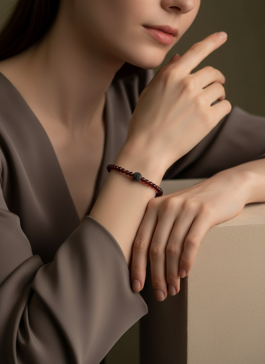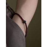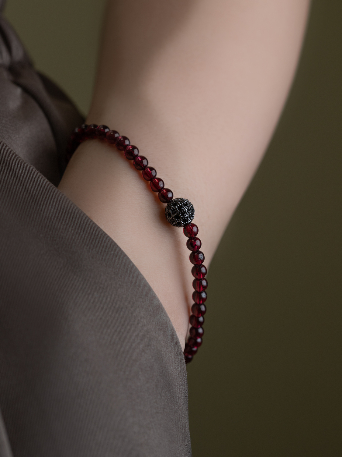 Браслет из натурального бордово-красного граната на эластичной резинке без замка. Дополняет красоту натурального камня чернёная бусина инкрустированная чёрными сверкающими фианитами, придающая украшению особый шарм.