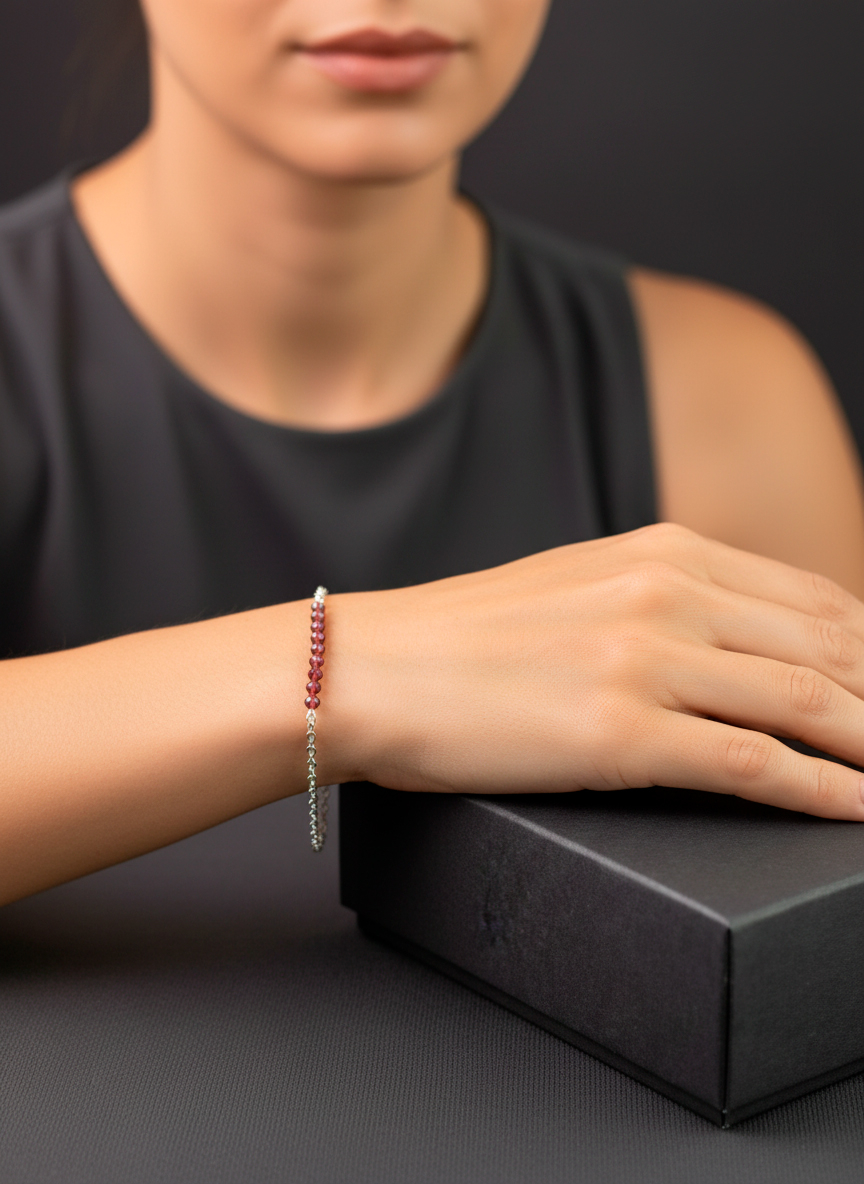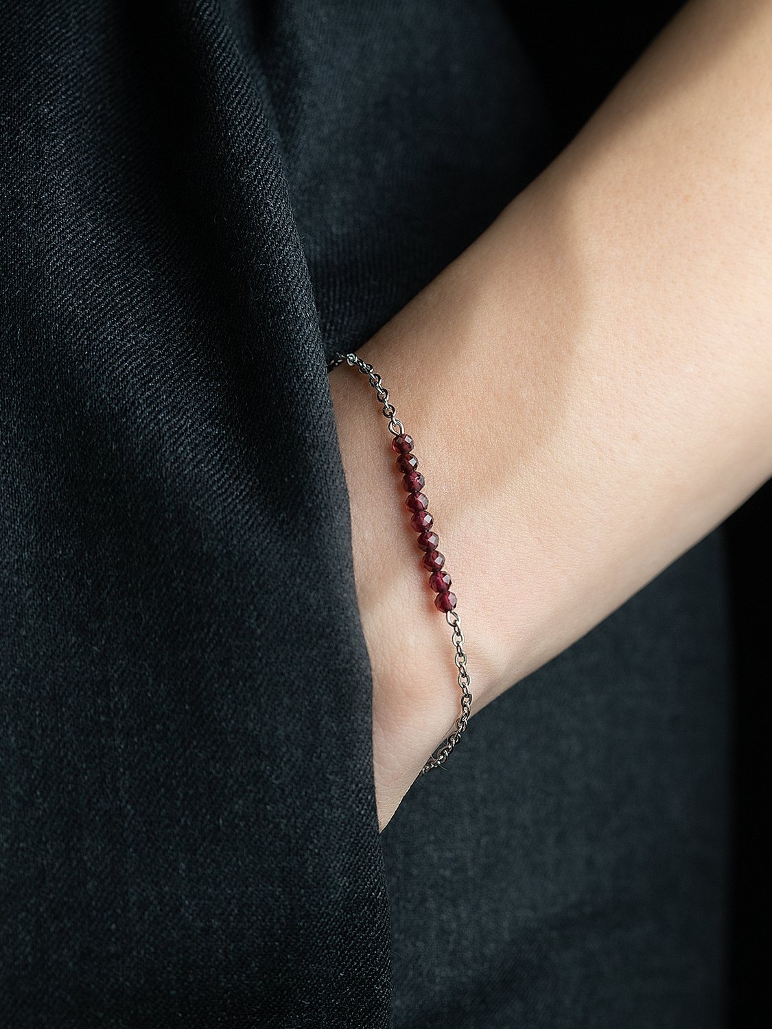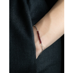 Изящный тонкий браслет-цепочка с натуральным гранатом (альмандином) бордового оттенка в форме бусин с огранкой, придающей особый блеск. Основа украшения - стальная цепочка с замком-карабином, который оснащен удлиняющей цепочкой для регулировки размера. Браслет смотрится изысканно и сможет дополнить как строгий деловой костюм, так и кокетливое платье.