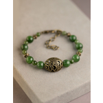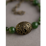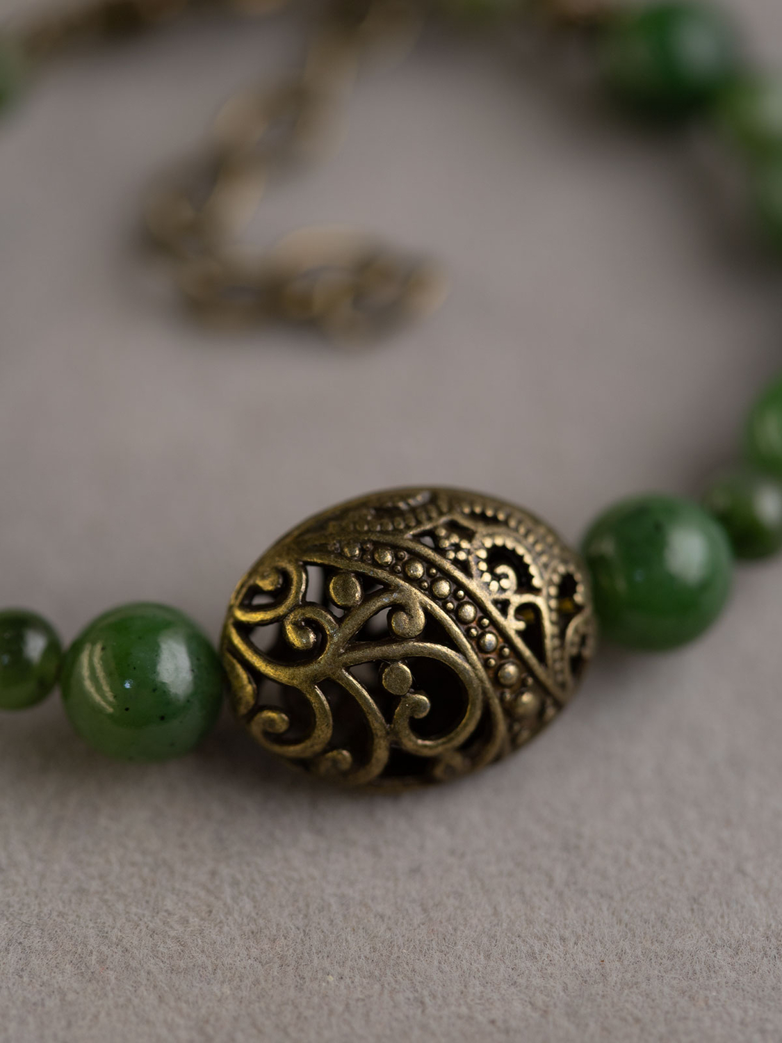 Браслет из натурального темно-зеленого нефрита на ювелирном тросике с замком карабином и удлиняющей цепочкой. Изюминка этого украшения - ажурная бусина по центру украшения. Такой аксессуар станет ярким акцентов в вашем образе.