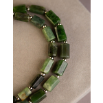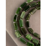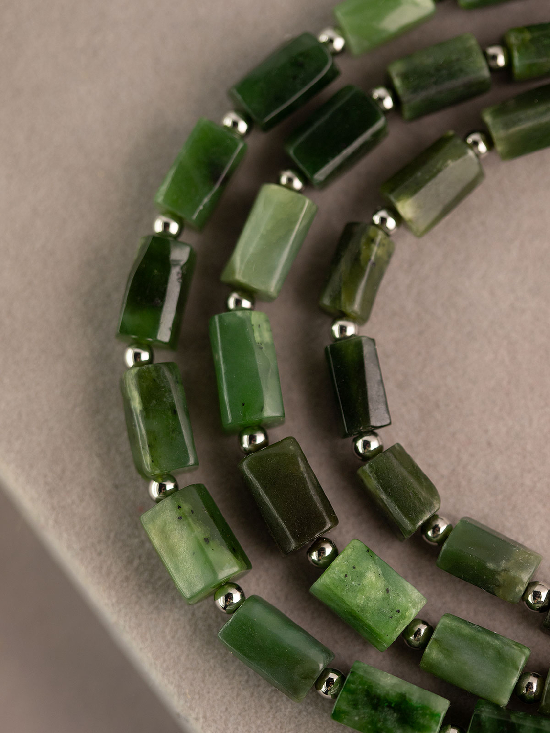 Авторские бусы из натурального нефрита. Камни с минимальной обработкой разных оттенков зеленого, чередуясь с небольшими металлическими бусинами, собраны на прочный ювелирный тросик и дополнены удобным замком карабином. Такие бусы дополнят образ и добавят изюминку. Украшение для стильных мужчин и женщин, которые любят неординарные украшения.