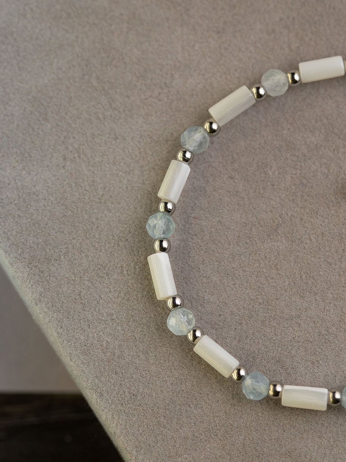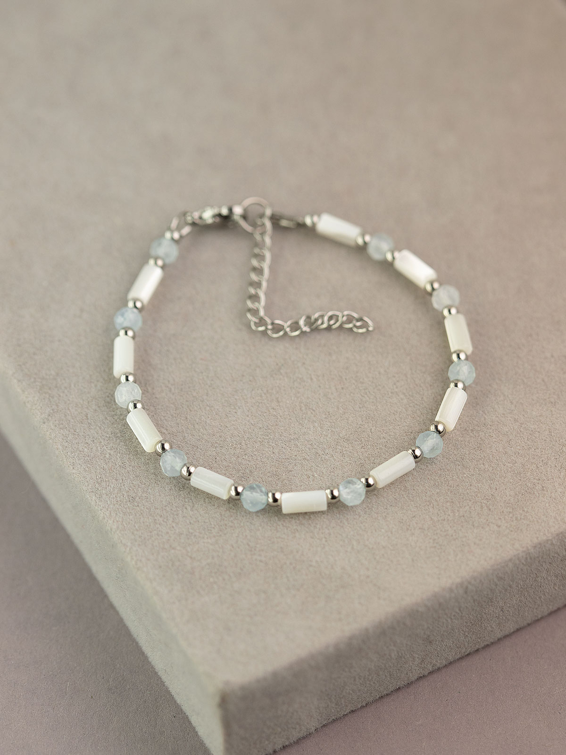 Элегантное украшение, созданное с особым вниманием к деталям. Браслет представляет собой изысканное сочетание натуральных аквамарина и переливчатого перламутра, которые гармонично переплетаются со стальными элементами.