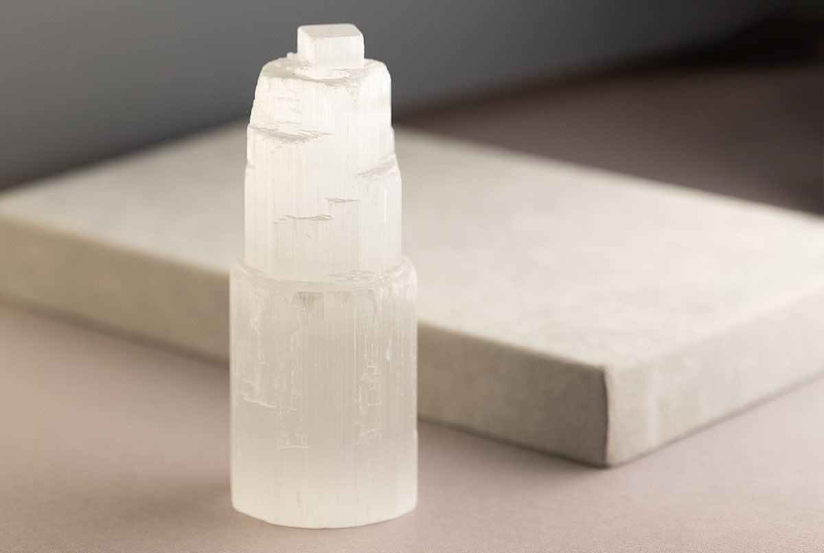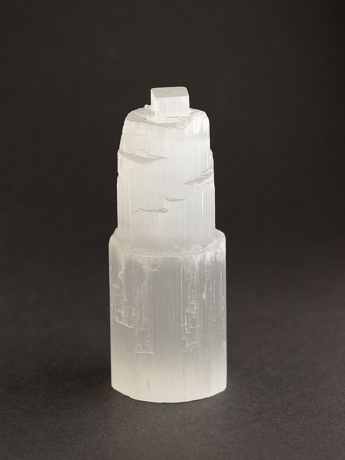 Натуральный селенит — удивительная волокнистая разновидность гипса с неповторимым шелковистым блеском. Эта башня представляет собой великолепное воплощение природной красоты в её первозданном виде.