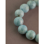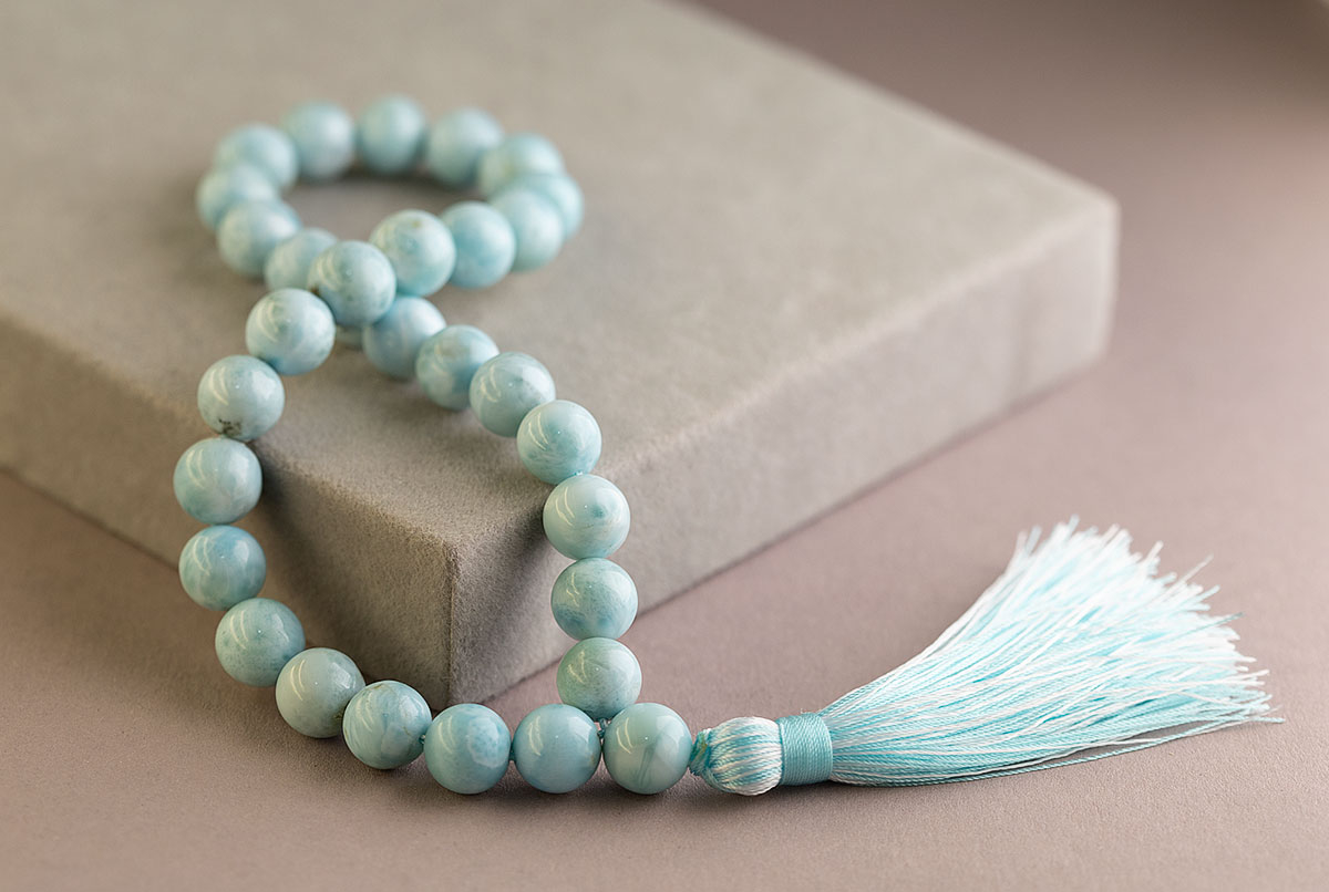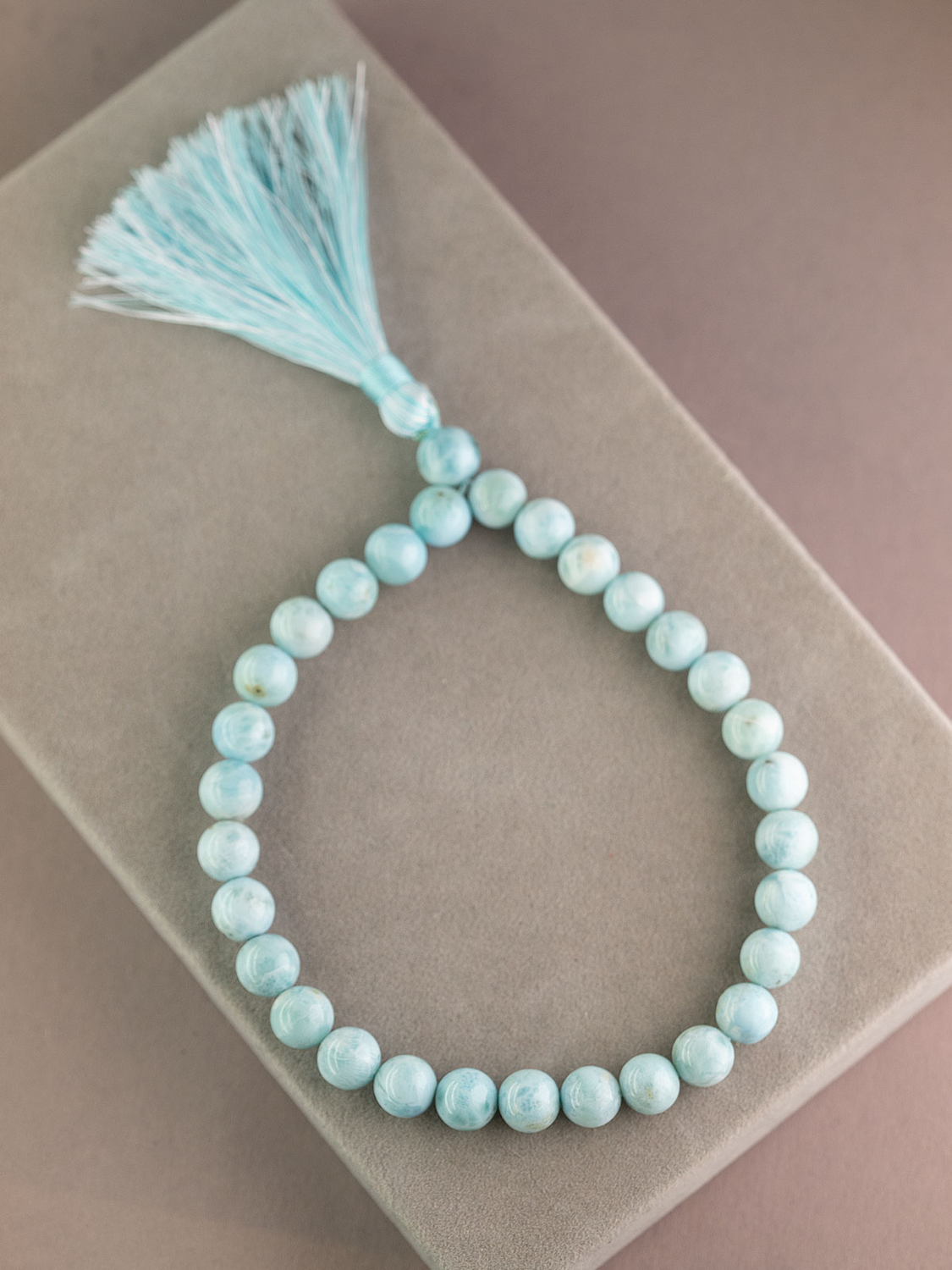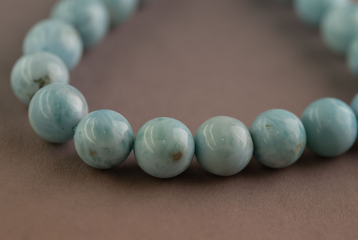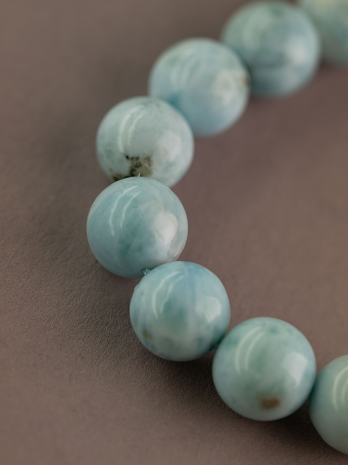 Каждая бусина тщательно отполирована, что подчёркивает природную текстуру и игру оттенков ларимара.
