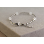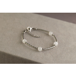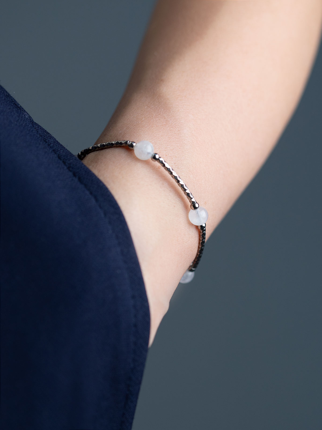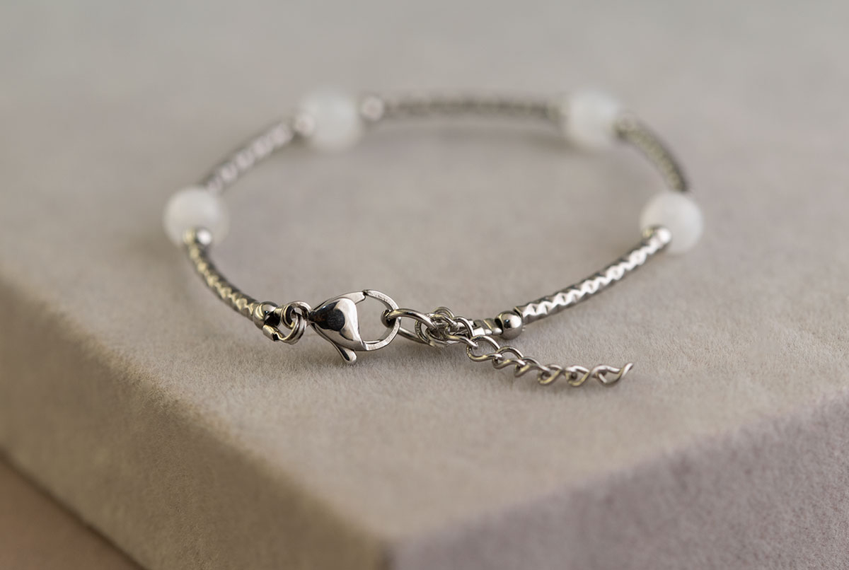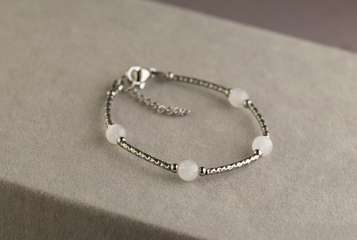 - Дизайн: чередование маленьких шариков лунного камня и длинных гранёных стальных трубочек — гармоничное сочетание органичных форм и строгой геометрии.
