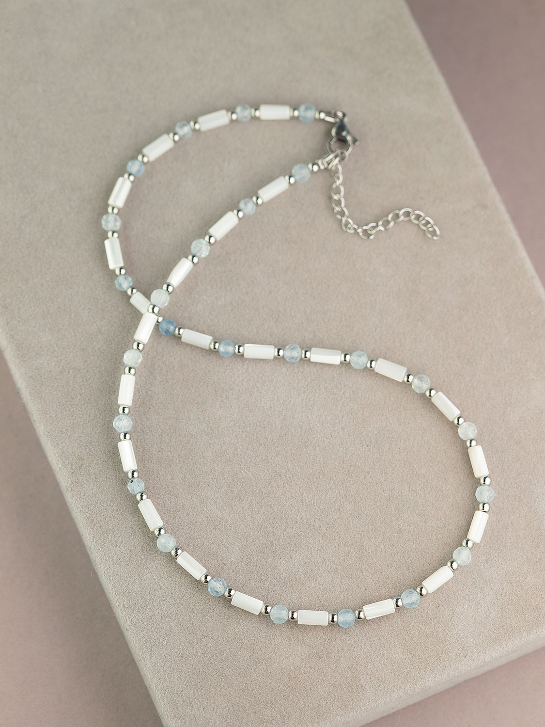 Материалы: натуральный аквамарин, белый перламутр, нержавеющая сталь.